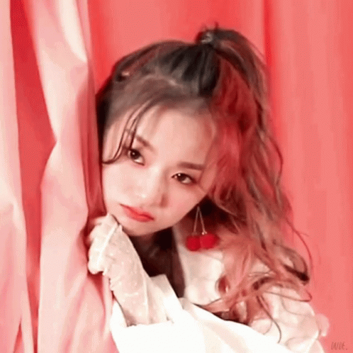 Fromis_9 member Nagyung posing elegantly against a red backdrop, wearing a white top and cherry earrings.