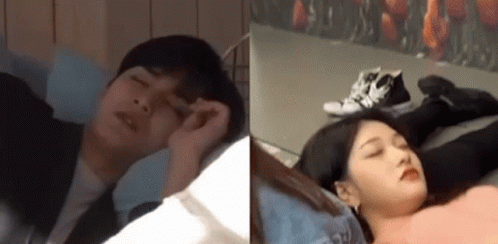 K-pop idols Mingyu from Seventeen and Seoyeon from fromis_9 are seen sleeping, possibly taking a nap.