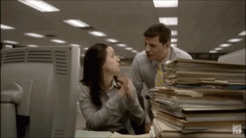 A man tells a woman to "Turn da frown de odder way around!" in an office setting, likely a Volkswagen commercial.