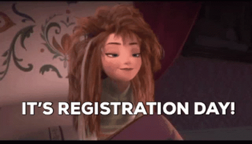 Frozen's Anna wakes up with messy hair, surprised by 'It's Registration Day!' announcement.