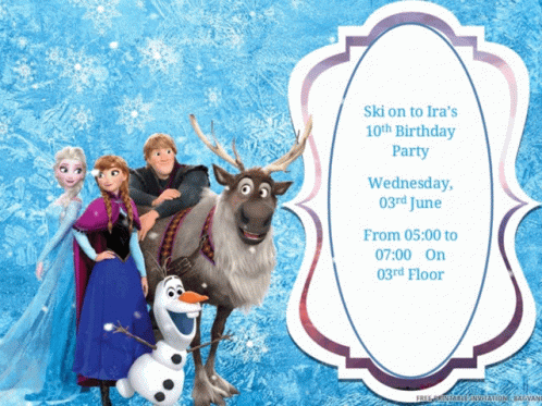 Frozen themed birthday party invitation featuring Elsa, Anna, Kristoff, Sven, and Olaf for Ira's 10th birthday.