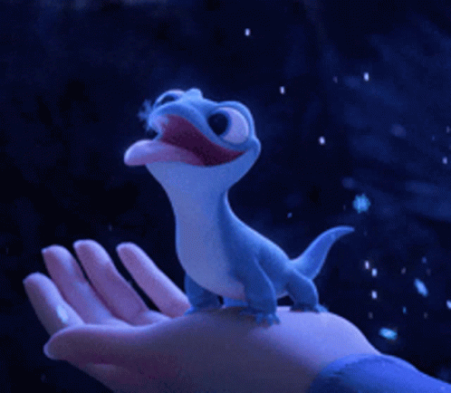 Bruni, the adorable blue fire spirit salamander from Disney's Frozen 2, sits on a person's hand.