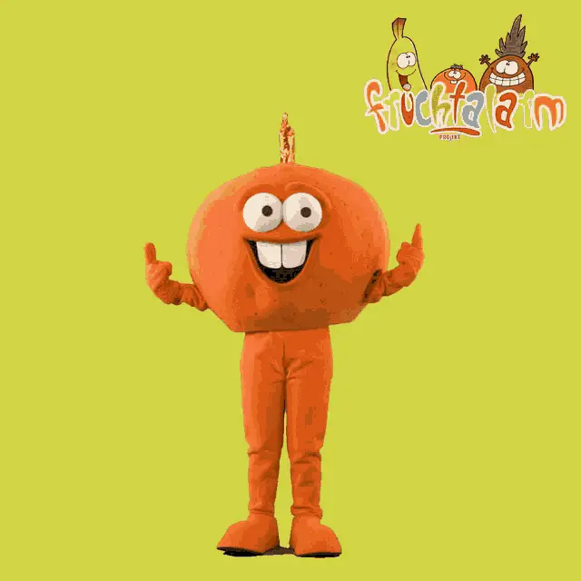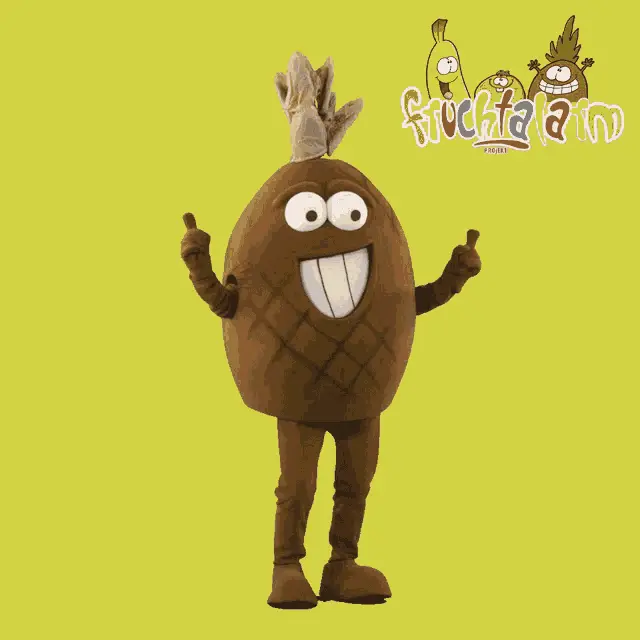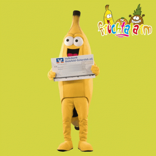 A cheerful banana mascot, part of the Fruchtalarm project, proudly holds a large check from Volksbank Bielefeld-Gütersloh eG.