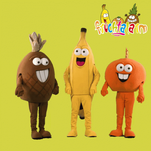 Fruchtalarm mascots: a happy banana, pineapple, and orange standing together.