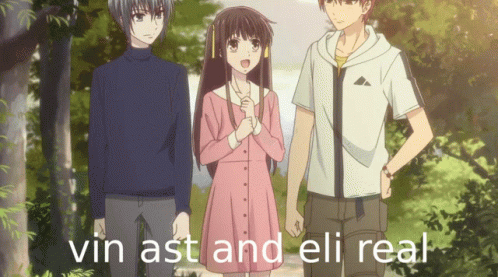 Tohru Honda, Kyo Sohma, and Yuki Sohma from Fruits Basket stand together, with text 'vin ast and eli real' on screen.