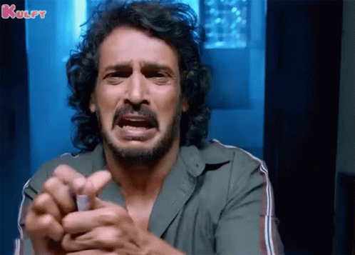 Actor Upendra shows intense frustration with a funny, exaggerated expression in a movie scene.