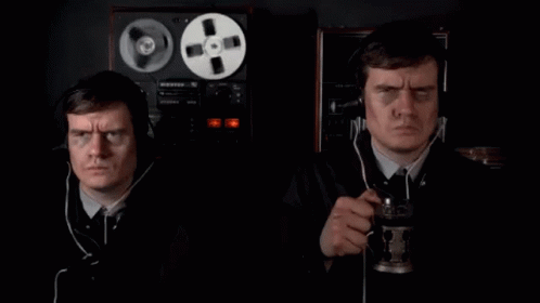 Two men in a dark room, wearing headphones and intently listening to a reel-to-reel tape recorder, evoking a spy or surveillance theme.