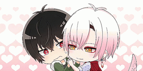 Two chibi anime characters from Fudanshi Isekai, one with black hair looking flustered, hugged by another with white hair.