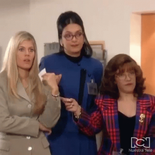 Three women from El Cuartel De Las Feas in an office, one pointing, from the Colombian telenovela Yo Soy Betty La Fea.