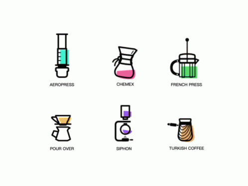 Icons of various coffee brewing methods, presented in the context of Fueled By Death Worlds Strongest Coffee.