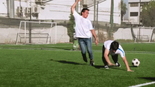 Two men, clearly out of shape and exhausted, struggle to play soccer on an artificial turf field.