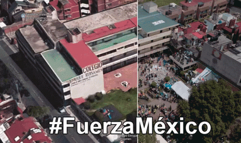 Aerial view of a building and crowd with the hashtag #FuerzaMéxico, symbolizing solidarity.