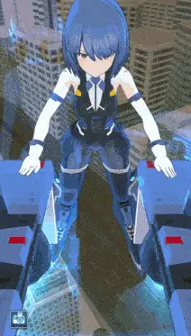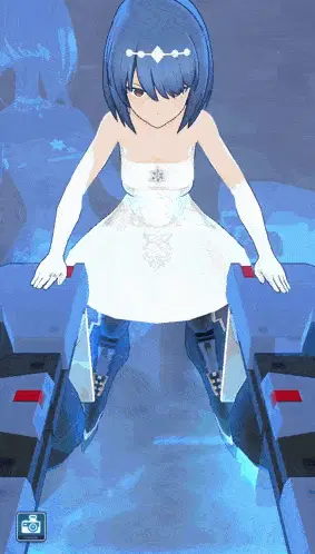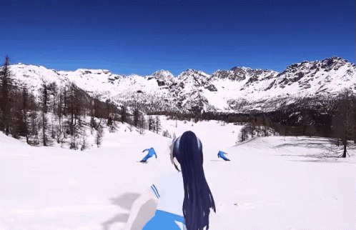 Fuji Aoi, an anime-style character, skis down a pristine snowy slope with majestic mountains in the background.