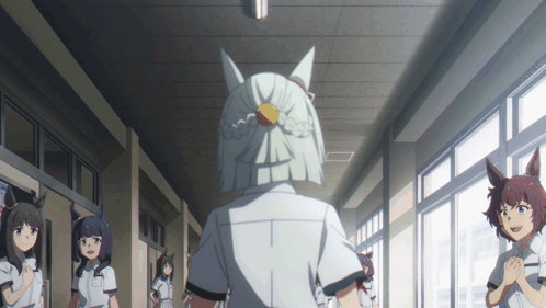a group of anime characters are standing in a hallway with one wearing a white mask