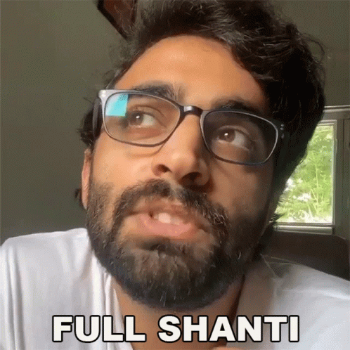 Rahul Dua, wearing glasses and a beard, looks directly at the camera and says 'Full Shanti'.