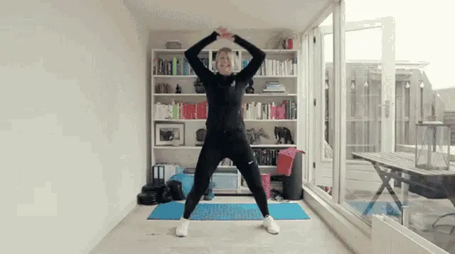 Mary-Kate Olsen as a young girl in Full House, enthusiastically doing a workout with small dumbbells, counting 'One...two...'