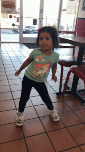 A happy little girl with a unicorn shirt shows off her fun dance moves in a restaurant.