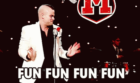 A man in a white suit performs live, with 'FUN FUN FUN FUN' displayed on screen, embodying joy and energy.