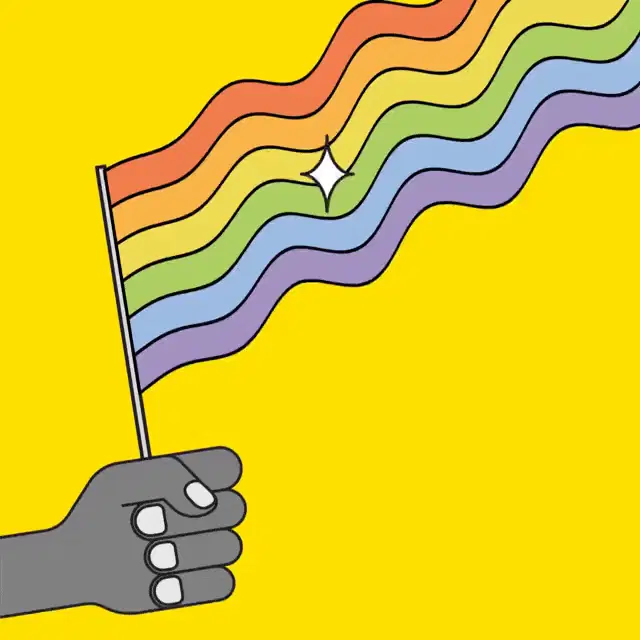 Omer's vibrant illustration of a person with a rainbow afro, reflective sunglasses, and colorful lips, embodying pride.