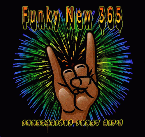 Animated graphic for Funky New 365, featuring a rock-on hand gesture and vibrant fireworks.