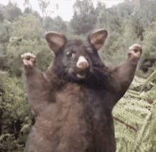 A possum stands on its hind legs with its front paws raised in a triumphant or excited pose amidst green foliage.