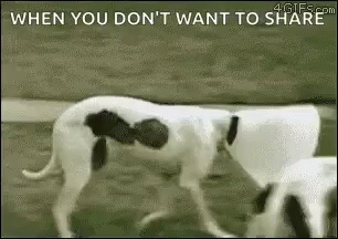 A group of dogs, likely whippets, humorously refuse to share food from a communal trough.