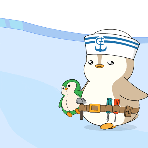 Pudgy Penguin, wearing a sailor hat and carrying a small green penguin, comically slips and falls on the ice.