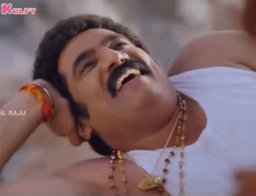 Telugu actor Rao Ramesh laughs heartily, wearing a white shirt and mustache, reacting to a funny joke.