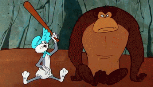 Bugs Bunny plays baseball, hitting a gorilla and exclaiming 'Ouch!' in a funny cartoon moment.