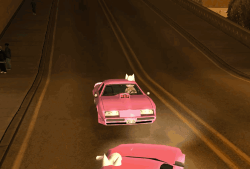 A pink car performs an epic airborne stunt, flying high above the city in Grand Theft Auto: San Andreas.