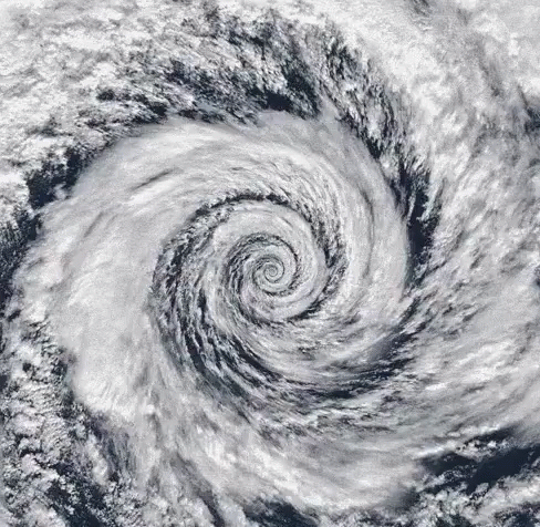 A mesmerizing, fractal-like swirl of clouds resembling a powerful hurricane or tornado.