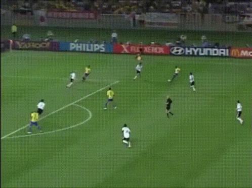 Ronaldo scores a spectacular goal in a football match, celebrating with his teammates. Featuring Rivaldo and Ronaldo.
