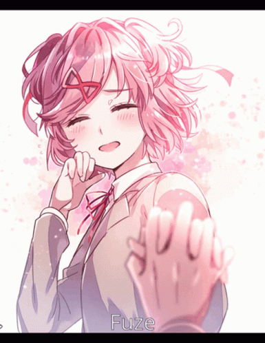 Natsuki from DDLC shows off her cute, happy, and angry expressions, accompanied by the text 'Fuze'.