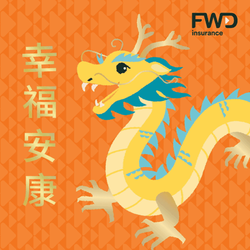FWD Insurance celebrates Chinese New Year with a vibrant yellow and blue dragon and a message of happiness and well-being.