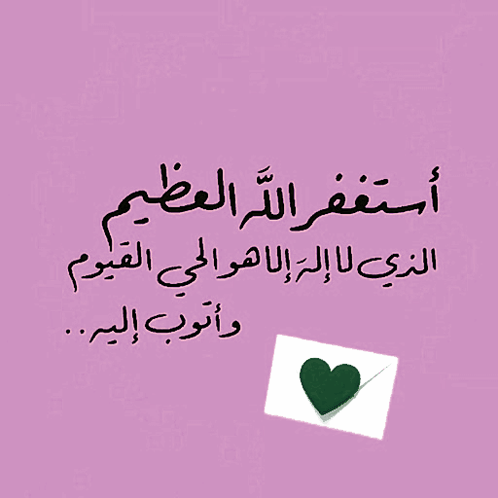 An animated message on a pink background, featuring Arabic calligraphy about seeking forgiveness from Allah and an envelope with a heart.