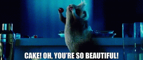 G Force Hurley, the Guinea Pig, excitedly reacts to a beautiful slice of cake, exclaiming 'CAKE! OH, YOU'RE SO BEAUTIFUL!'