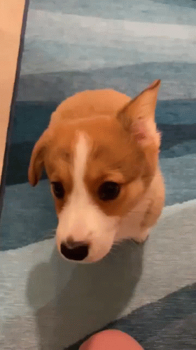 Adorable brown and white puppy Gabu looking at the camera, with one ear up and one ear down.