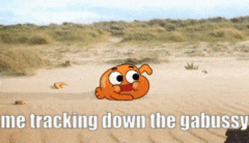 Darwin from The Amazing World of Gumball tracking down the 'gabussy' in various environments.