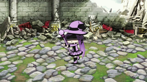 A Gacha Life Indonesia character with purple hair and hat performs a magic power attack in a ruined setting.