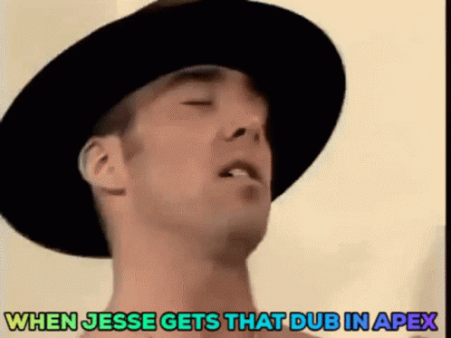 A man in a cowboy hat makes a funny face, reacting to Jesse getting a 'dub' (win) in the game Apex Legends.