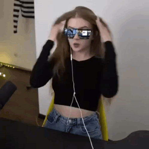 Gaechkatm, a girl wearing stylish sunglasses and headphones, sits at a desk making peace signs and pointing gestures.