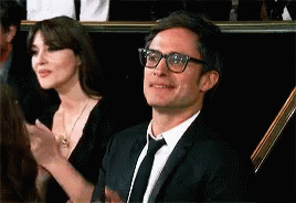 Gael García Bernal, wearing glasses and a suit, smiles and applauds at an event.