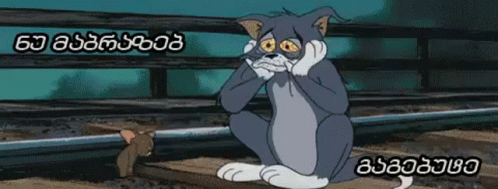 Tom and Jerry look sad and regretful, with Georgian text 'I'm sulking, you make me angry' on screen.