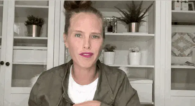 A woman reacts with disgust and gags while painting her toenails, presumably due to stinky feet.