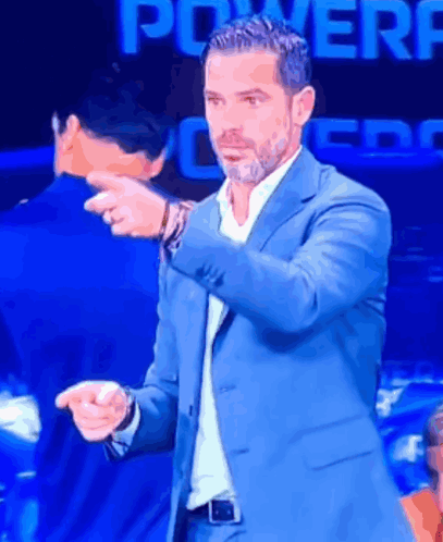 Fernando Gago, or a man resembling him, in a blue suit, intensely pointing with both hands, with a Powerade sign in the background.