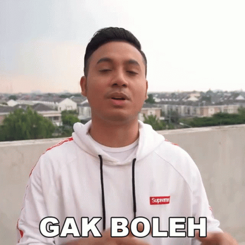 Gunawan, wearing a white Supreme hoodie, emphatically says 'Gak Boleh' (Not Allowed).