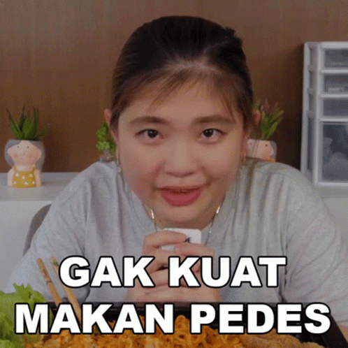 Fifin Liefang struggles with spicy food, expressing 'Gak Kuat Makan Pedes' while eating.