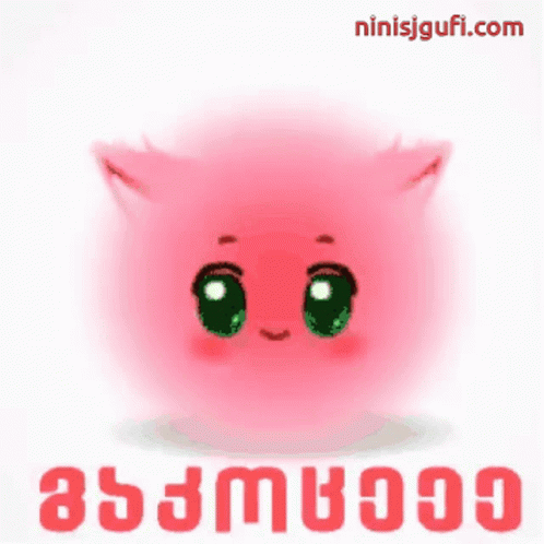 A cute pink cartoon creature with Georgian text "I kissed you kiss" and "ninisjgufi.com".