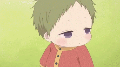 Gaku Baby, the adorable anime character, looks around with a curious and slightly sad expression.