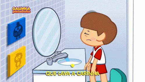 A boy from the Galinha Pintadinha cartoon washes his face at the sink in the bathroom, looking in the mirror.